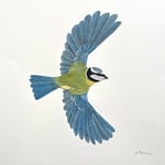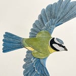 A one-off original artwork featuring a bluetit in flight This artwork has been created using collaged paper with individual feathers being meticulously cut and layered. The collaged sections have been drawn into before being assembled using an archival pH neutral glue. The collage is mounted onto Fabriano Artistico paper, a beautiful smooth heavy weight paper. The artwork is signed.