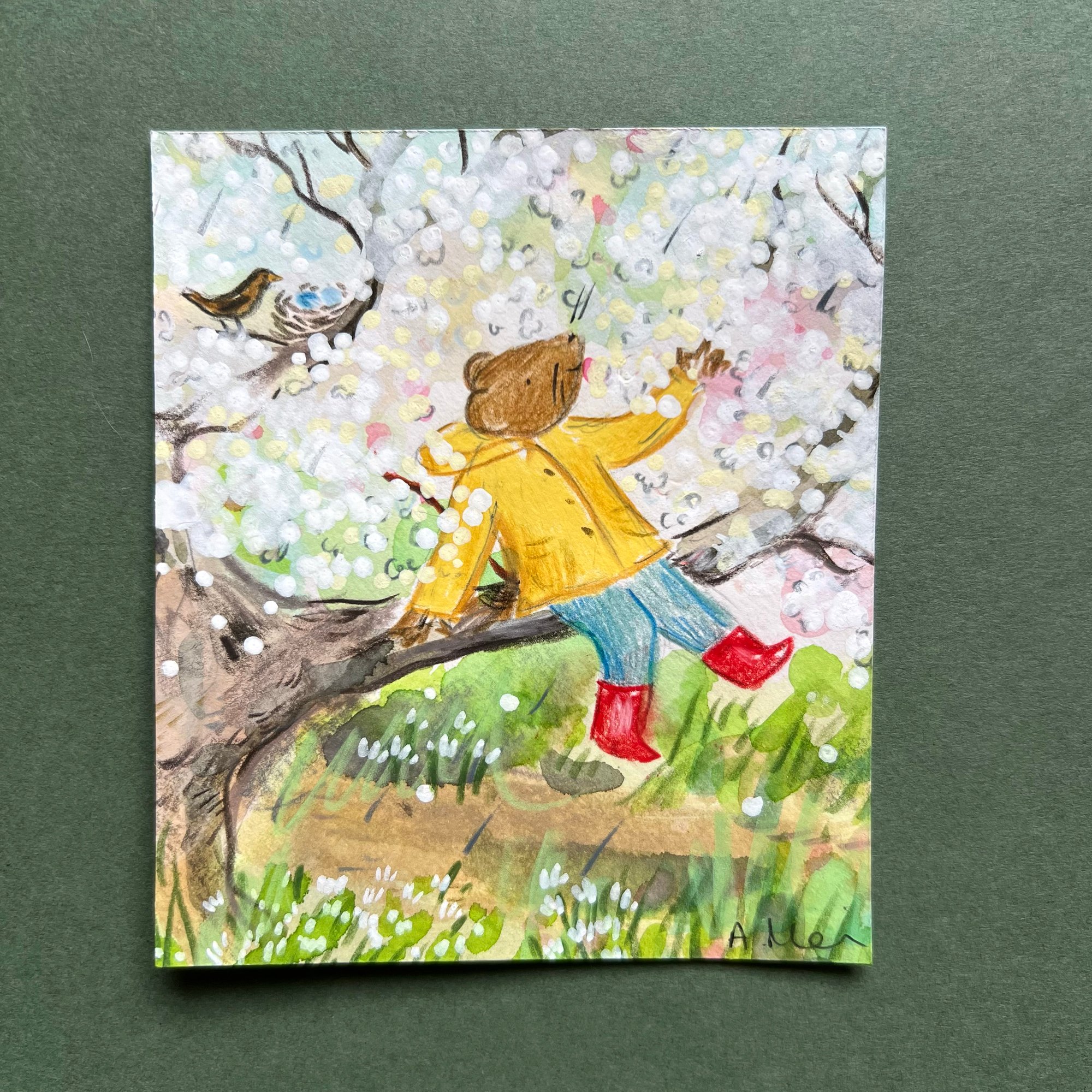 This original artwork was a preparatory study for my Mouse series of books published by Thames and Hudson. This original drawing was created using inks, pencils and paint and features the character of Mouse perched among the spring blossom during an April shower. The artwork is signed.